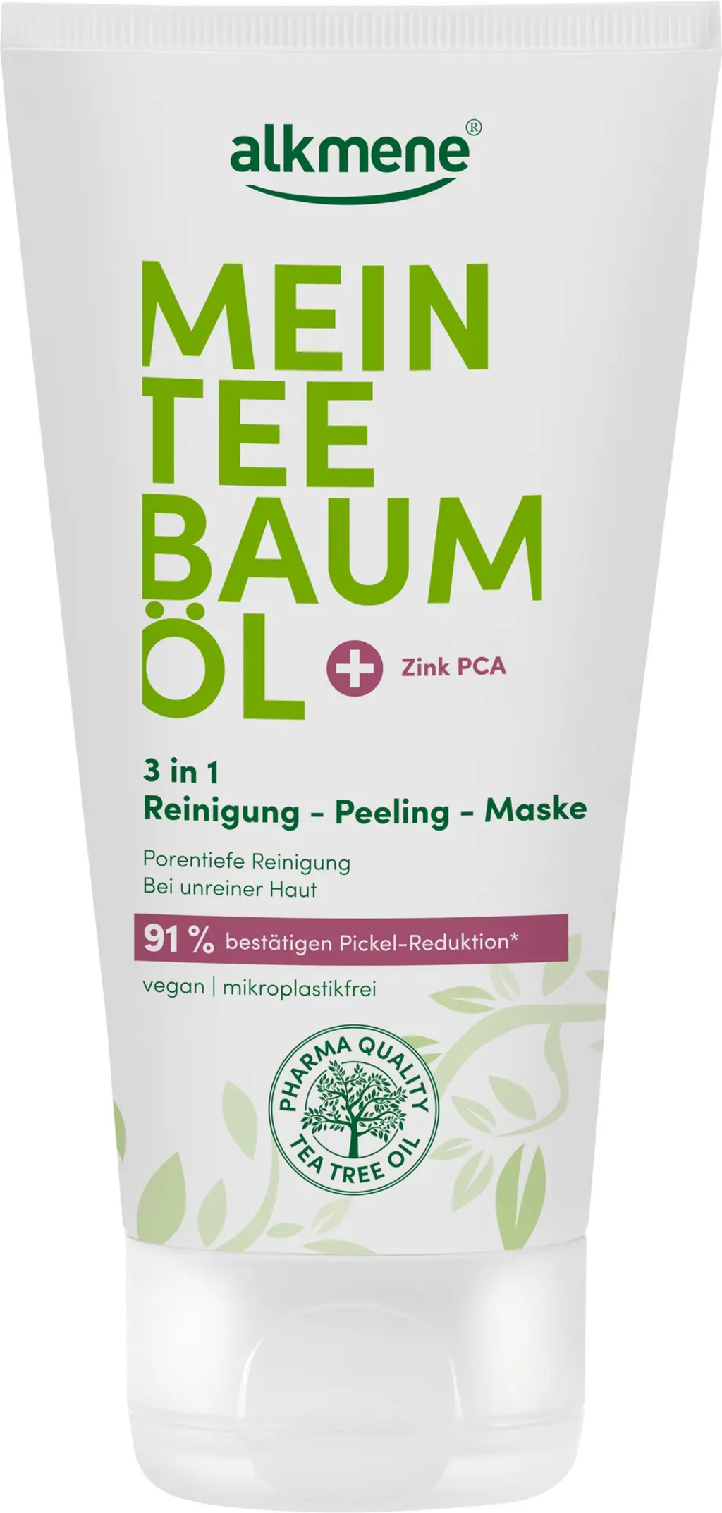 Tato 3v1 čisticí péče od značky alkmene čistí pleť do hloubky, díky pečující kombinaci tea tree oleje a zinku PCA. Můžete ji použít jako každodenní čisticí gel, peeling nebo masku. Spolehlivě odstraňuje nečistoty, odumřelé kožní buňky, přebytečný maz i make-up. Složení je veganské a bez mikroplastů.