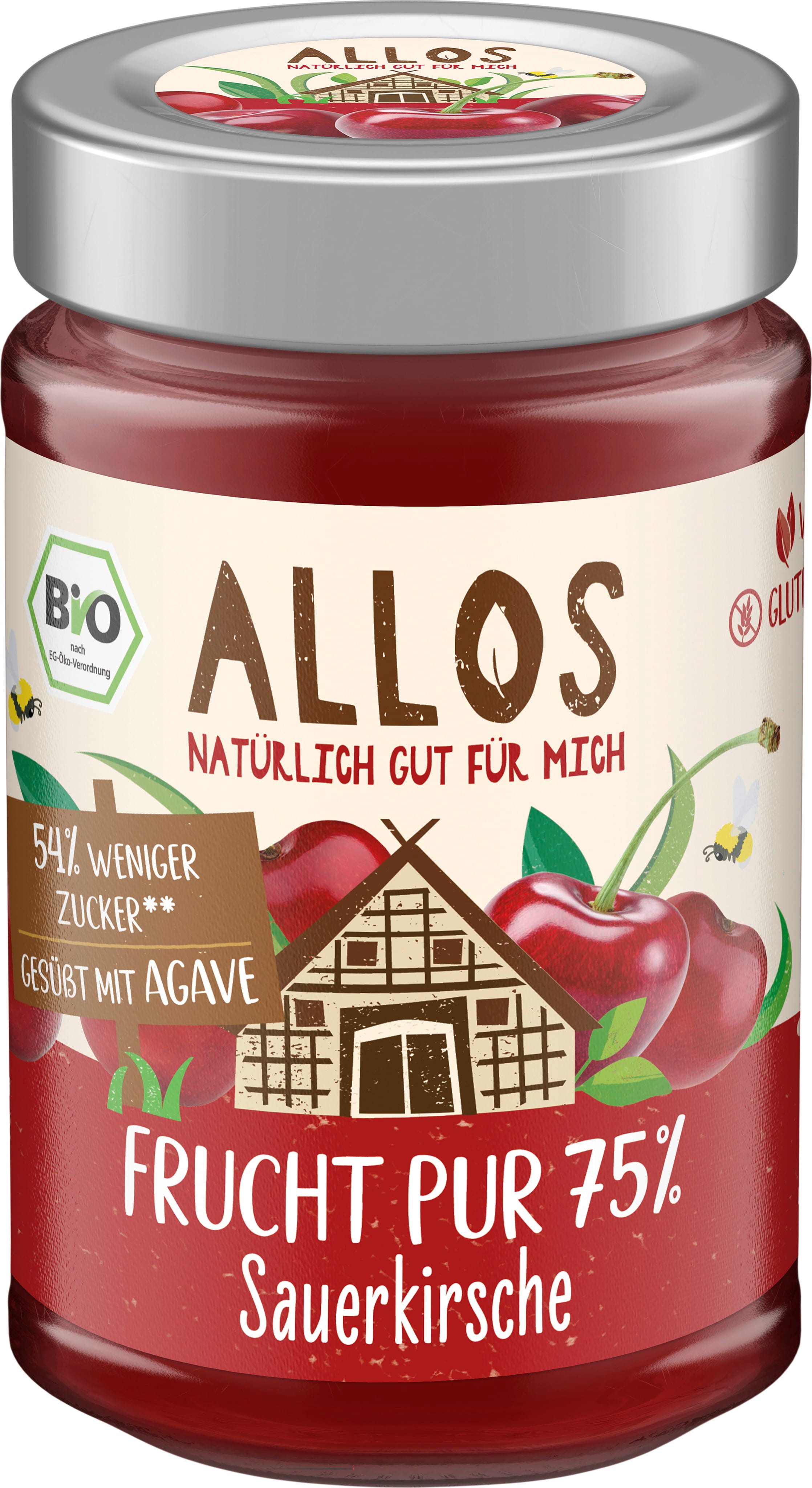 Čistá ovocná příchuť pro Váš snídaňový chléb: ALLOS Vám nabízí Bio 75% čisté ovoce - višně. U této varianty jsou višně šetrně zpracovány a doplněny sladkostí agávového sirupu. Ideální kombinace lehké kyselosti a přirozené sladkosti. Přípravek je veganský a obsahuje o 54 % méně cukru.
