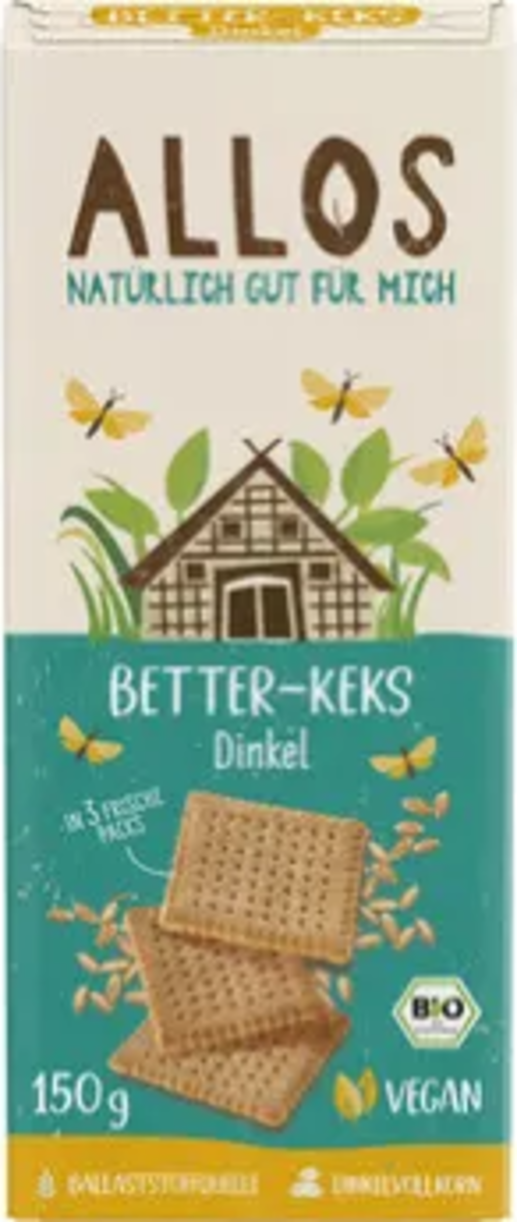 Bio Better špaldové sušenky od ALLOS jsou chuťově výraznou alternativou klasických máslových sušenek. Jsou vyrobeny zcela bez másla, ale s hodnotnou celozrnnou špaldou a vylepšené bourbonskou vanilkou. Veganské.