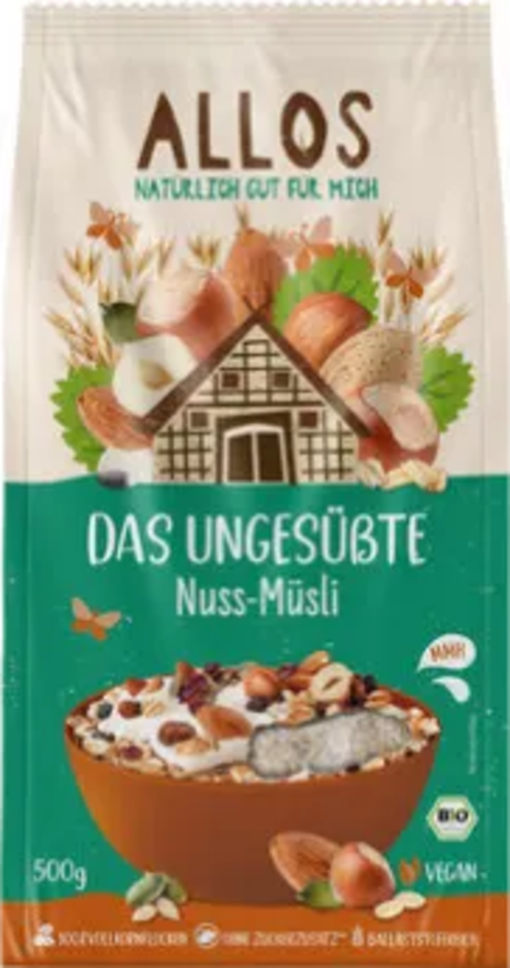 Müsli plné lahodných ingrediencí, jako jsou celozrnné vločky, mandle, lískové oříšky, dýňová semínka a kokosové lupínky, Vám nahradí sladkosti. Neslazené ořechové müsli od společnosti ALLOS je vyrobeno z celozrnných vloček a lupínků i vybraných semínek a ořechů a má vysoký obsah vlákniny. Pro dobrý a nekomplikovaný start do nového dne.