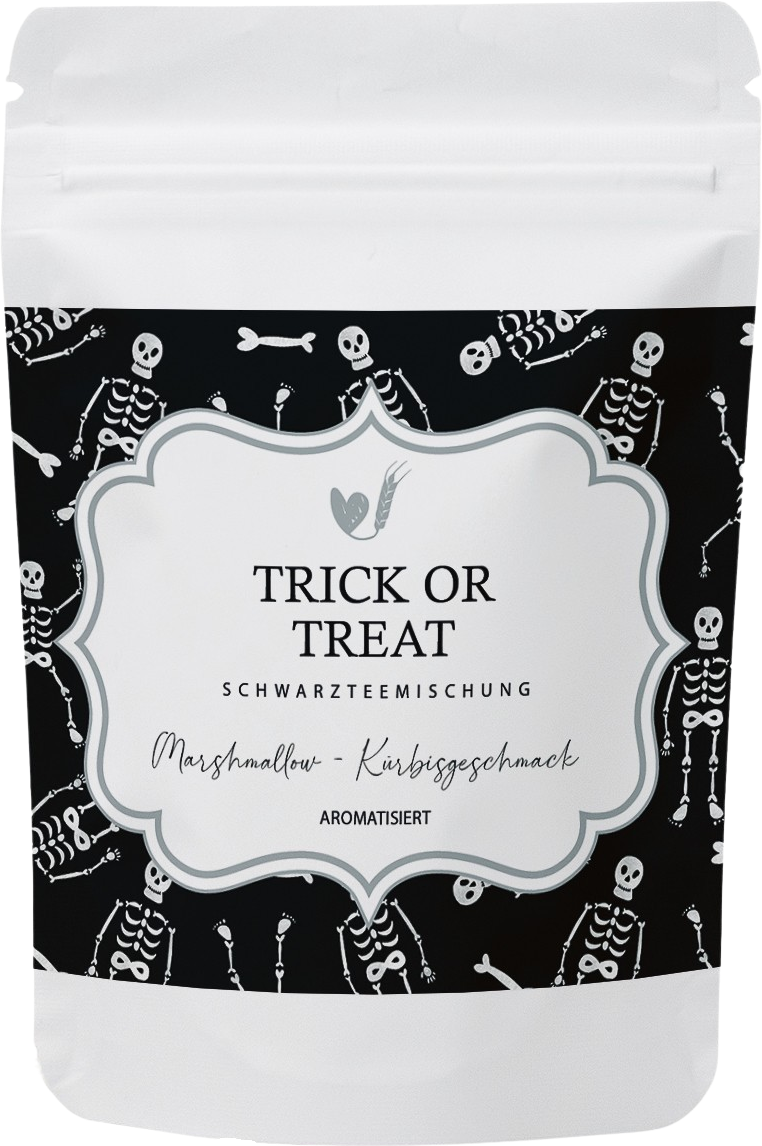 "Trick or Treat" čaj od Bake Affair představuje směs černého čaje s halloweenskou tématikou naplněnou kousky dýně a marshmallow, stejně jako hřejivým kořením, jako je skořice a badyán. Tento aromatický čaj přináší do šálku podzimní pohodu a je ideální teplý i ledový. Pro období Halloweenu.