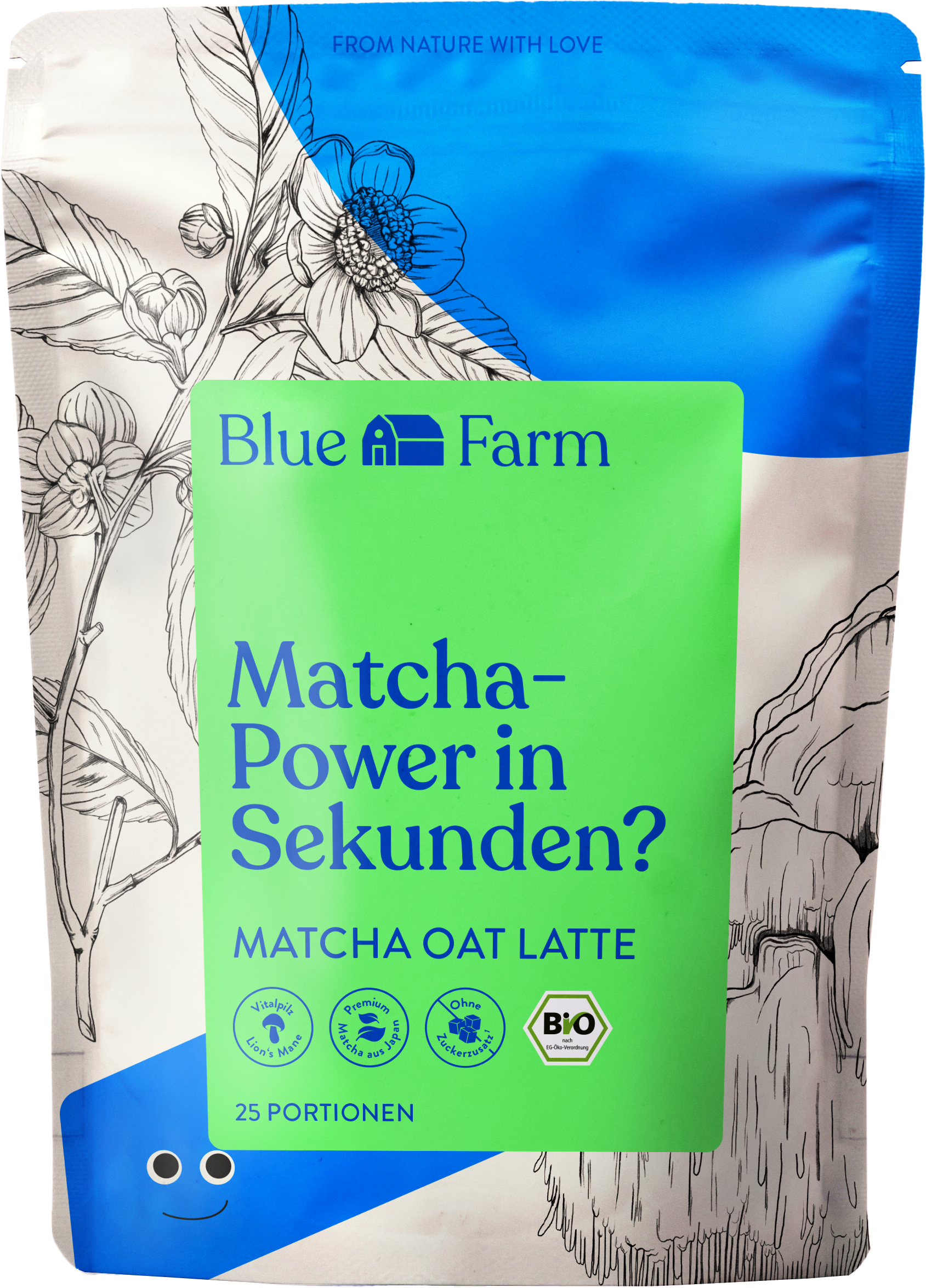 Bio Matcha Oat Latte od Blue Farm kombinuje vysoce kvalitní matcha s vitální houbou Lion's Mane a krémovým ovesným práškem pro vytvoření speciálního chuťového zážitku. Díky své jemné a lehce nahořklé notě a přirozené sladkosti ovsa je lahodnou alternativou ke konvenčnímu mléku nebo rostlinným nápojům.
