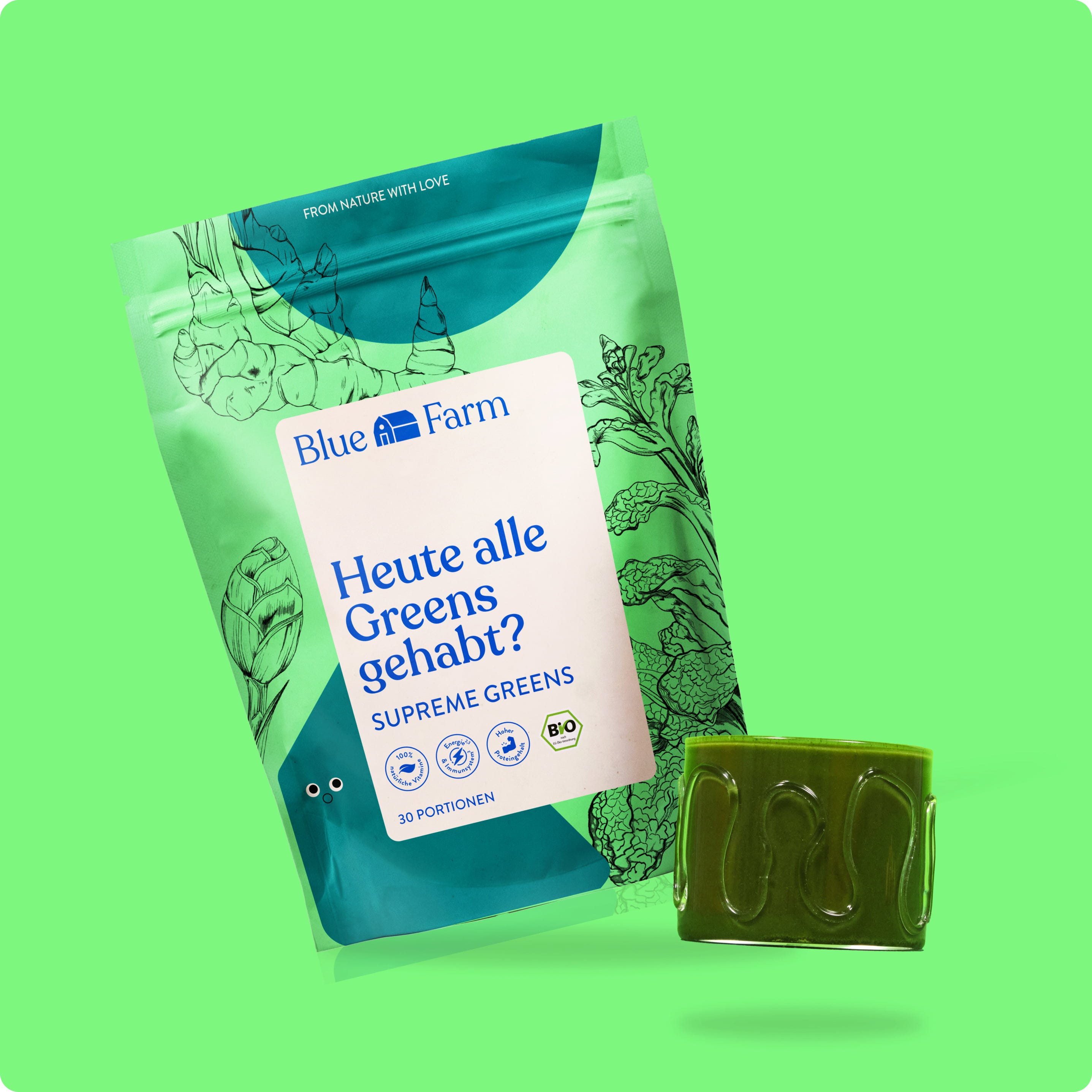 Bio Supreme Greens nápojový prášek od Blue Farm nabízí výživnou směs bio ovocných a zeleninových prášků, řas, rostlinných bílkovin a adaptogenů z vitálních hub. Prášek je bez přidaného cukru a představuje praktické all‑in‑one řešení pro každodenní rutinu. Díky jednoduché přípravě s vodou nebo rostlinným mlékem je Supreme Greens ideální pro všechny, kteří mají málo času, ale nechtějí slevit z nároků na pestrost a kvalitu.