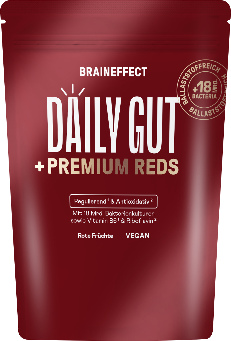 Daily Gut + Premium Reds je prášek od BRAINEFFECT. Obsahuje 18 miliard aktivních bakteriálních kultur z 12 vybraných kmenů Lactobacillus a Bifidobacterium. Ty se přirozeně vyskytují i ve Vašem střevě. Prášek navíc obsahuje sedm přírodních trávicích enzymů. Je doplněn o ovocnou směs sedmi červených plodů, které dodávají antioxidanty. Navíc je prášek bez přidaného cukru a bez umělých sladidel.