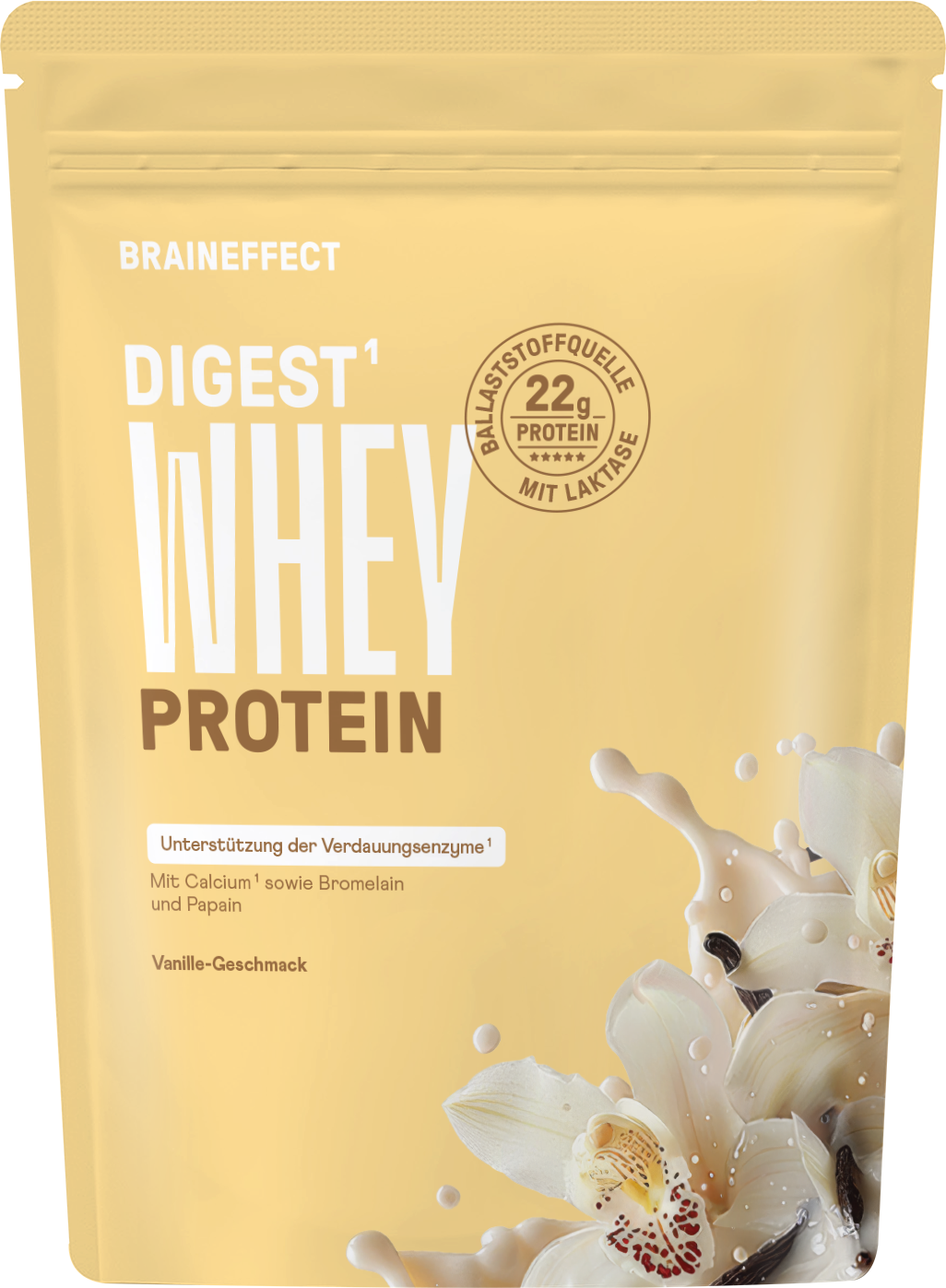 WHEY DIGEST Protein je prášek od BRAINEFFECT. Prášek má vysoký obsah bílkovin. WHEY DIGEST Protein navíc obsahuje přírodní trávicí enzymy bromelain a papain. Je doplněn o vápník. Prášek navíc obsahuje laktázu. Ta štěpí mléčný cukr laktózu, a je proto vhodný při citlivosti na laktózu.