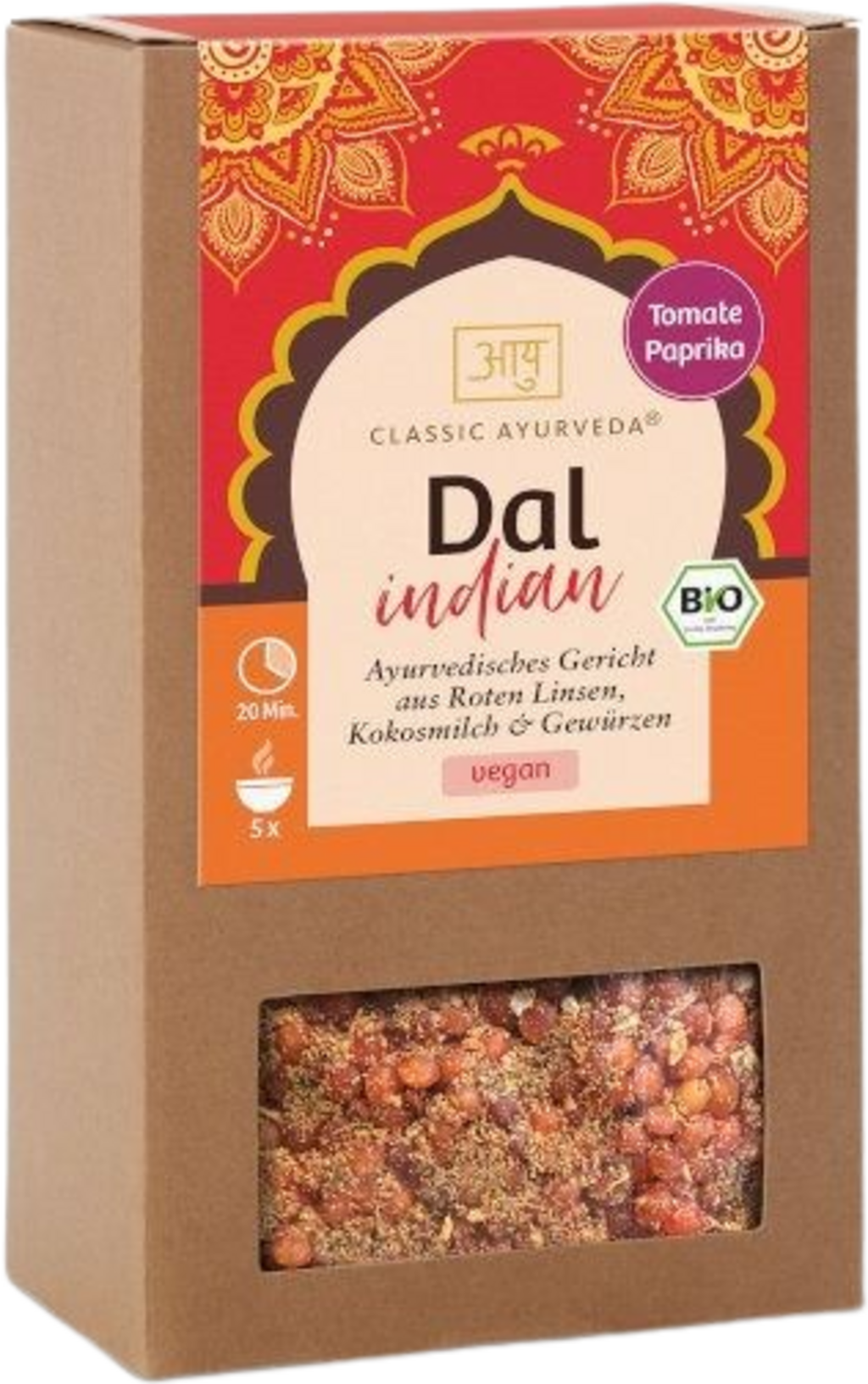 Tato ajurvédská hotová směs od značky Classic Ayurveda Vám umožní snadno si připravit tradiční Dal. Základ tvoří červená čočka, která, díky kokosovému mléku v prášku, získává sametově krémovou konzistenci. Ovocná chuť rajčat a cibule je doplněna harmonickou směsí koření, kmínu, papriky, zázvoru a chilli. Chuťový profil završují kamenná sůl, hořčičné semínko, kerblík a asafoetida. Všechny zemědělské složky pocházejí z kontrolovaného bio zemědělství a pokrm nabízí vydatné, kořeněné jídlo s jemnou pikantností.