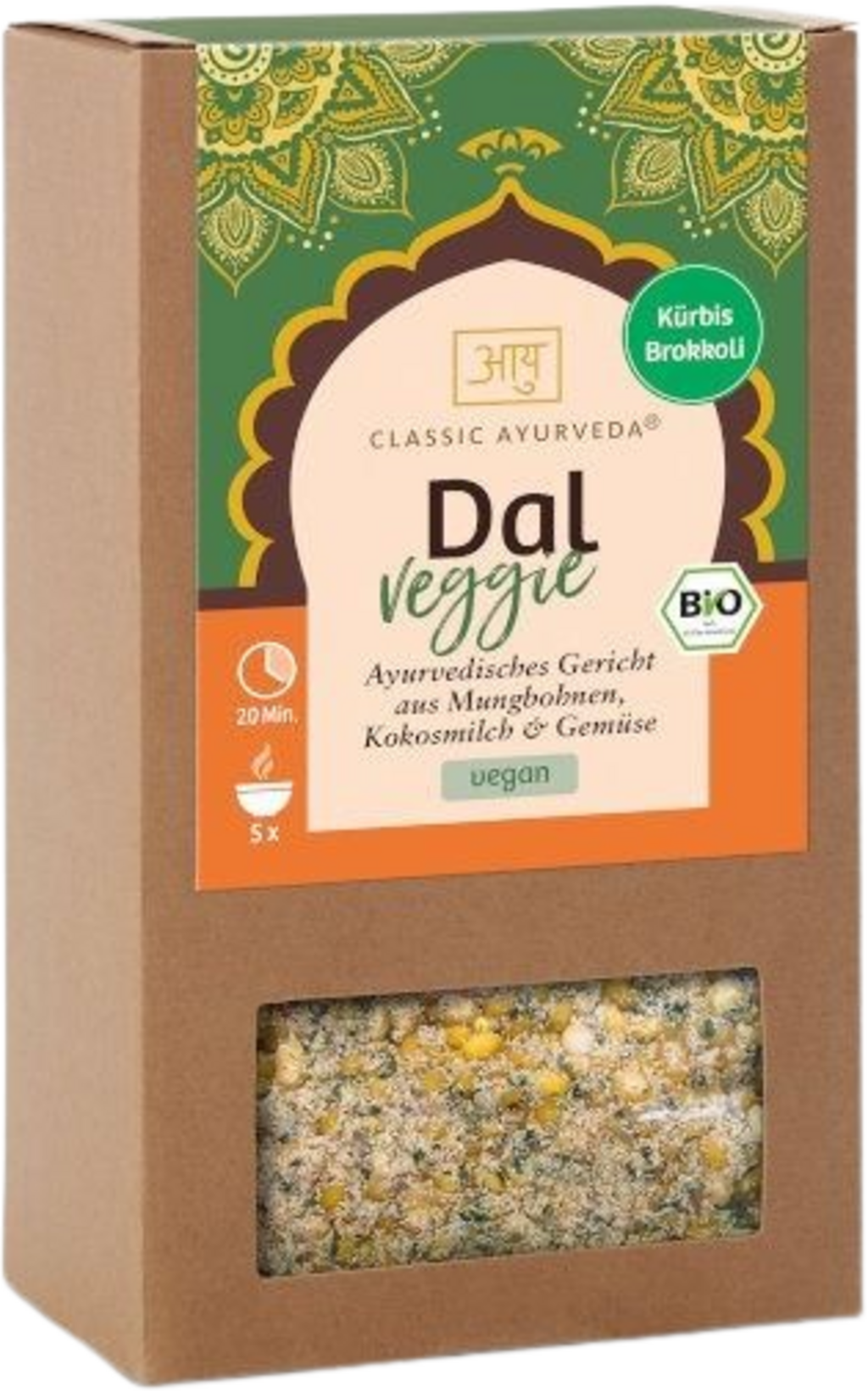 Bio Dal od značky Classic Ayurveda je založený na jemně loupaných žlutých mungo fazolích, které tvoří krémový a plný základ. Směs obsahuje výběr zeleniny, jako je dýně, brokolice, mrkev, pórek a cibule, a je dochucena kokosovým mlékem v prášku. Pečlivě vyvážená kombinace koření, kmín, zázvor, koriandrové listy, hořčičné semínko, chilli a asafoetida, dodává pokrmu aromatickou rovnováhu. Pokrm je složen výhradně z přírodních surovin z kontrolovaného bio zemědělství a je navržen jako rostlinný zdroj bílkovin.