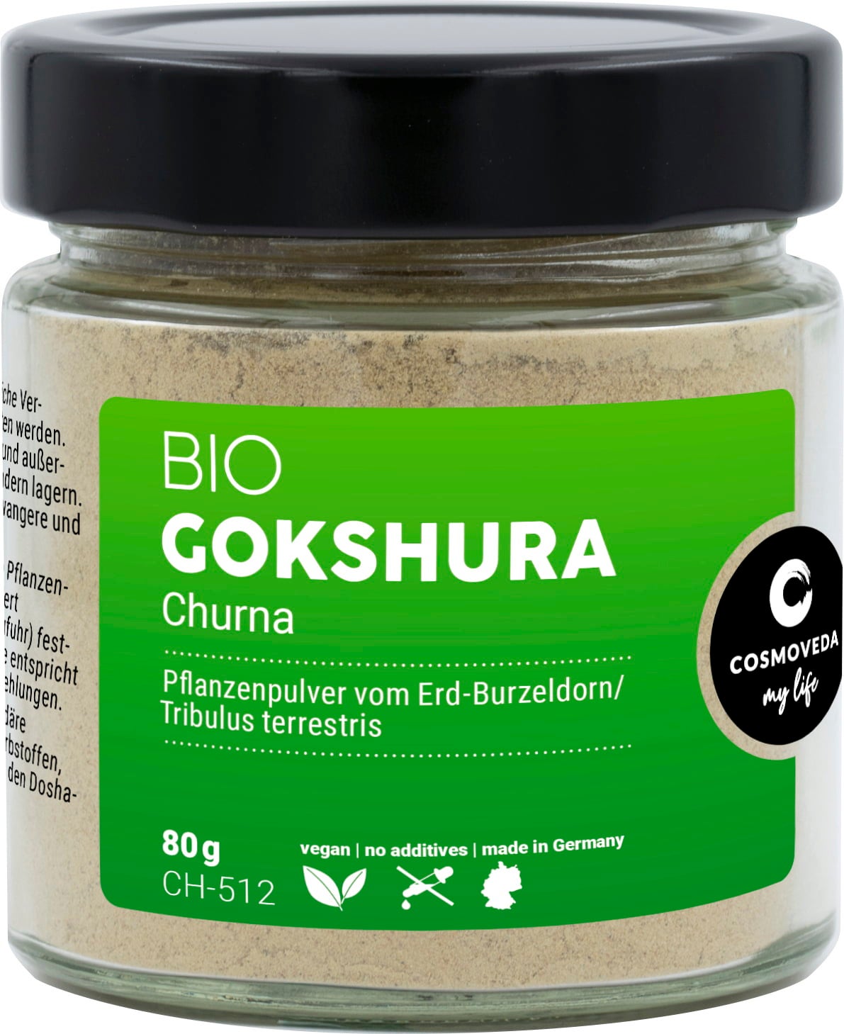Gokshura - Tribulus terrestris - je jednoletá až dvouletá bylina, vysoká až 90 cm, s párovými listy, žlutými květy a kulovitými plody. Všechny části rostliny se používají v ajurvédské výživě. Prášek ze sušené celé rostliny, který je při výrobě jemně a šetrně rozemletý (pod 40 °C), pochází z indických a srílanských projektů bio Fair Trade značky COSMOVEDA.