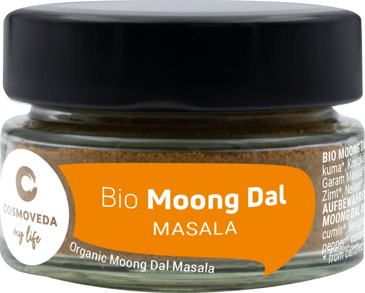 Bio Moong Dal Masala od Cosmoveda je ajurvédská směs vybraného koření pro pokrmy z Moong-Dal.