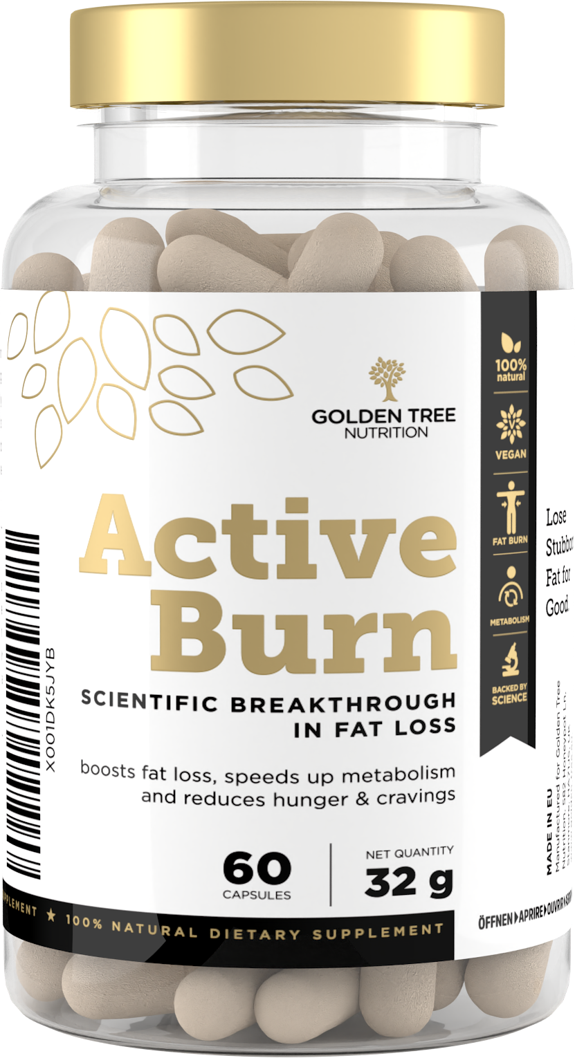 Active Burn od Golden Tree je termogenní doplněk, který kombinuje 8 vysoce kvalitních účinných látek. Veganské složení spojuje vybrané rostlinné extrakty, důležité vitamíny a esenciální stopové prvky.