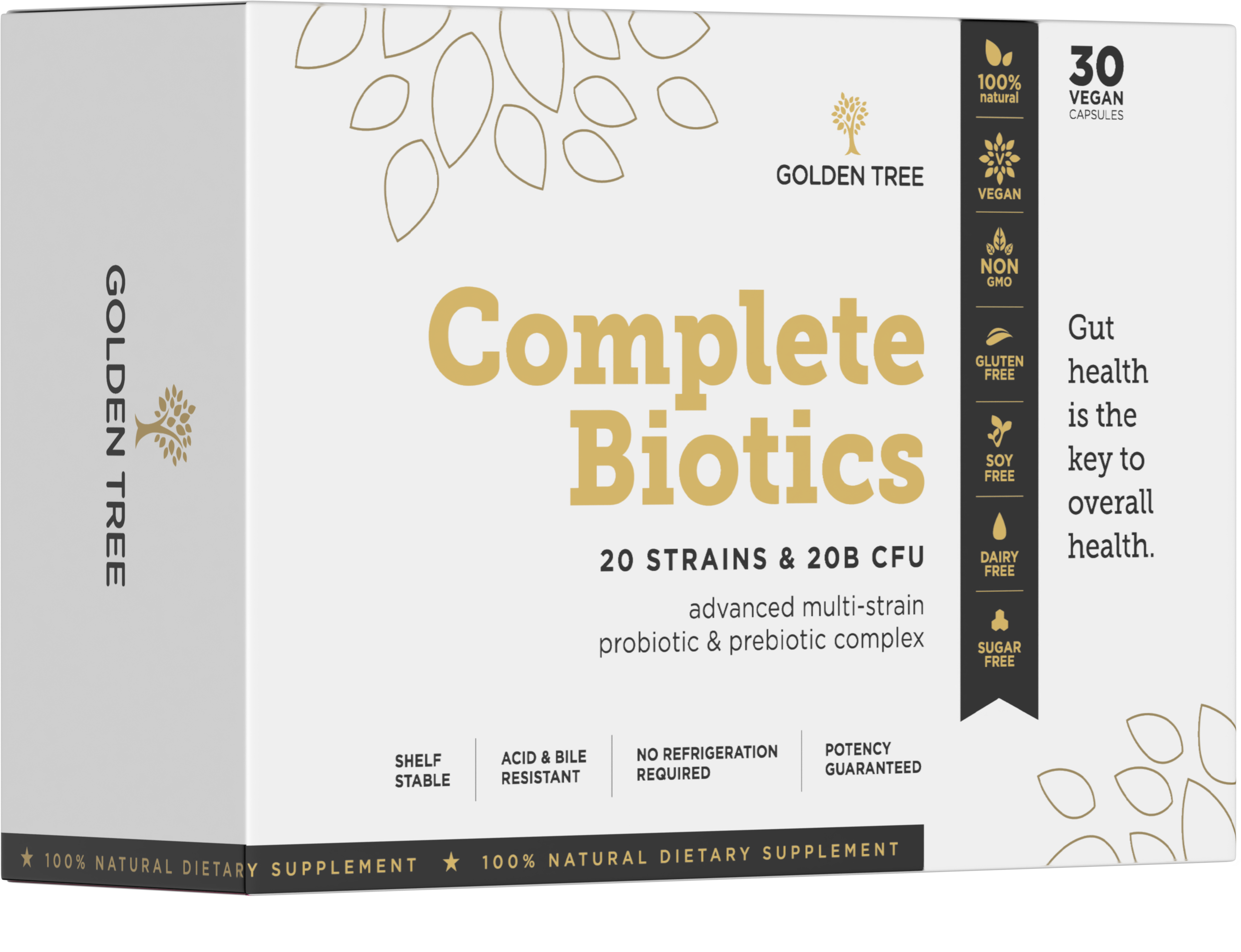 Complete Biotics od Golden Tree je komplexní probiotický přípravek s celostním účinkem. Každá z 30 kapslí obsahuje 20 miliard prospěšných bakterií z 20 různých kmenů. Díky odolnosti vůči žaludeční kyselině a žluči se bakterie bezpečně dostanou až do střeva. Další výhodou je speciální balení v ochranné ALU-PVDC fólii – kapsle tak mají dlouhou trvanlivost a lze je snadno uchovávat při pokojové teplotě.