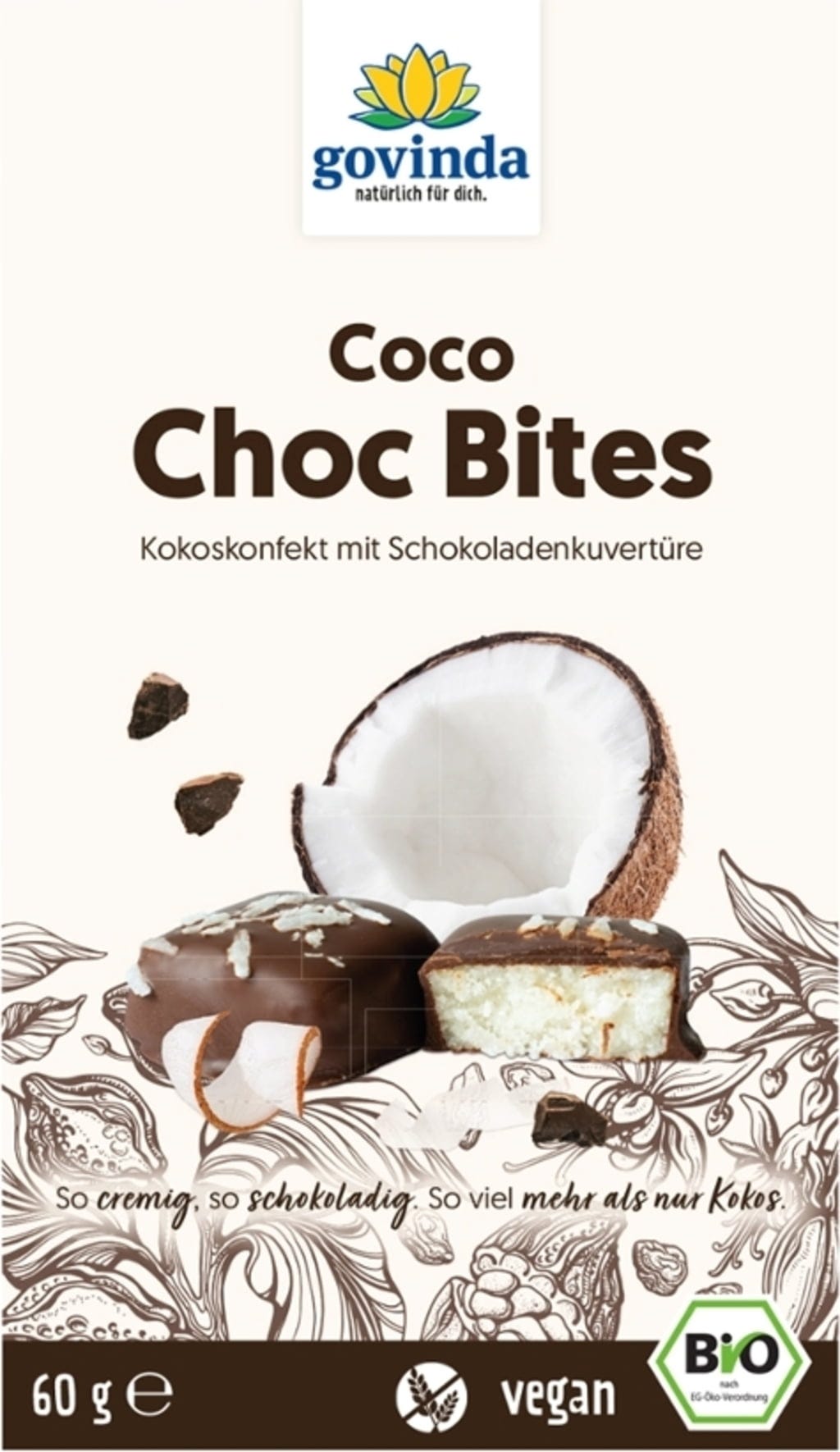 Bio Coco Choc Bites od Govinda jsou tropickým potěšením z jemných kokosových vloček a hodnotného kokosového oleje. Jemná sladkost agávového sirupu dokonale ladí s lehce hořkým tónem čokoládové couverture s obsahem kakaa nejméně 70 %. Tato veganská bio sladkost je vyrobena ze surovin z kontrolovaného bio zemědělství a představuje kvalitní alternativu pro milovníky exotického mlsání.
