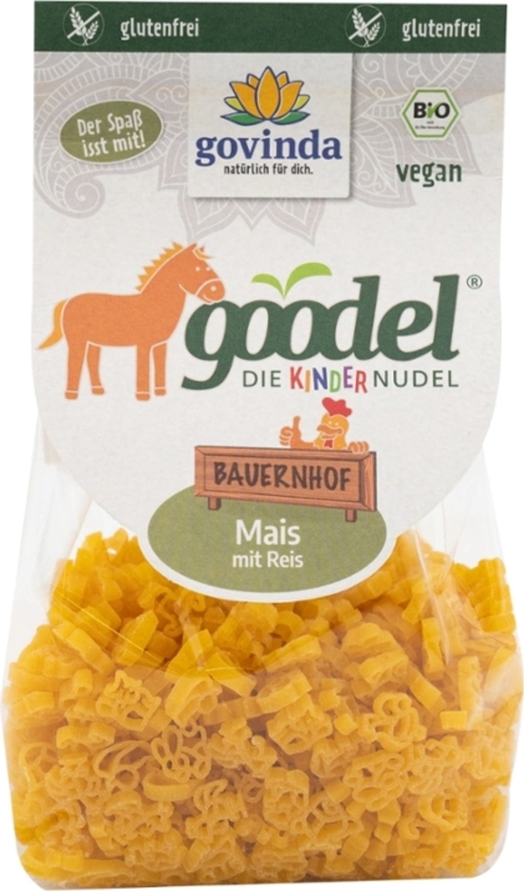 Bio Kinder-Goodel těstoviny „Statek“ s kukuřicí a rýží od značky Govinda přinášejí na talíř hravost i radost z jídla. Tyto těstoviny jsou vyrobeny z italské kukuřice a rýže, ručně zpracovány a šetrně sušeny. Díky bezlepkové receptuře představují kvalitní volbu pro vědomé stravování. Roztomilé tvary zvířátek a jemná chuť z nich dělají oblíbené jídlo pro malé gurmány.