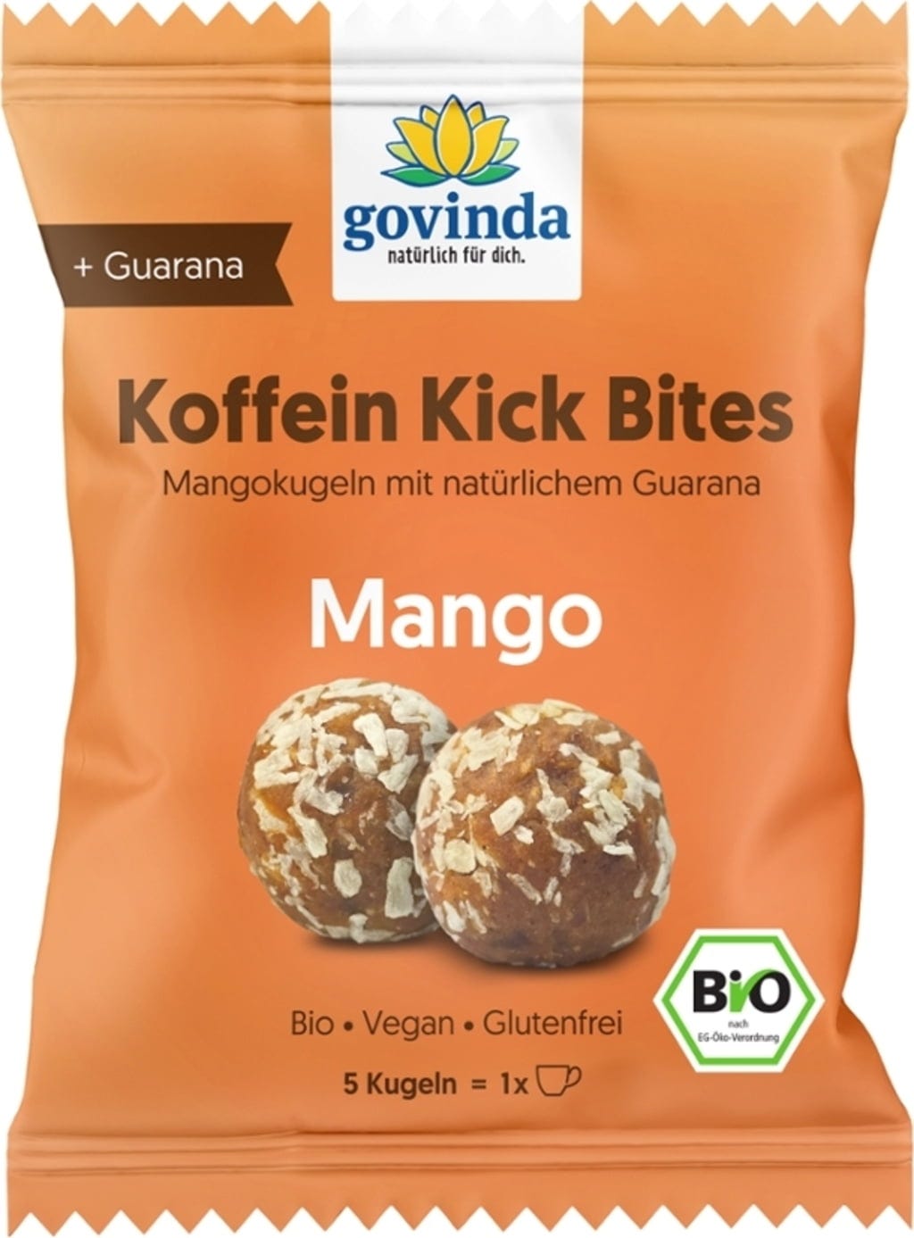 Bio kofeinové Kick Bites - mangové od značky Govinda spojují ovocnou sladkost manga a datlí s účinky přírodní guarany. Zjemněné kokosovými vločkami a rýžovým sirupem nabízejí tyto kuličky exotické aroma v bio kvalitě. Bezlepková a veganská cukrovinka je ideální volbou pro ovocnou svačinu v praktickém formátu, která se obejde bez umělých přísad.