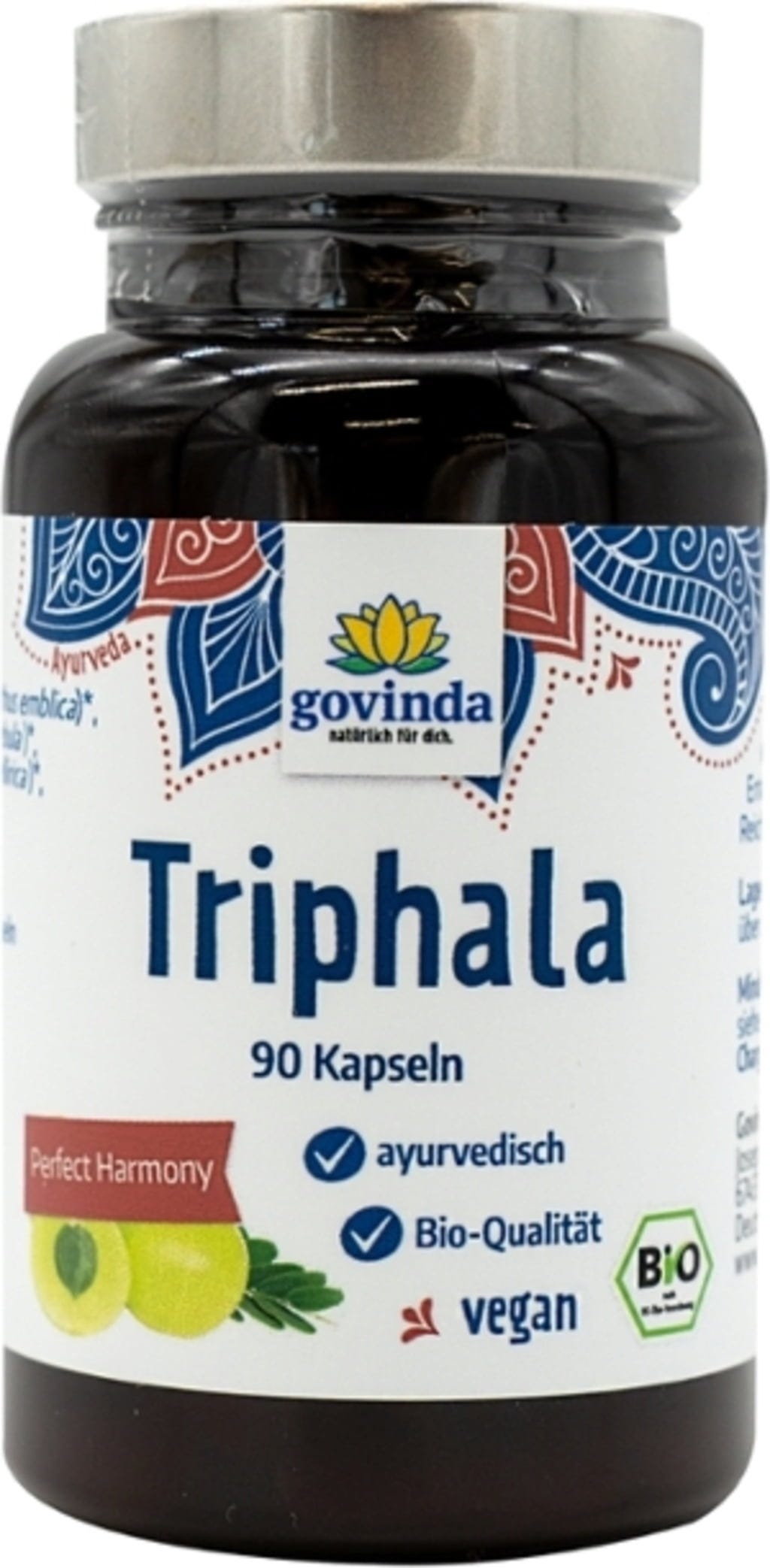 Doplněk Triphala značky Govinda obsahuje plody amly, bibhitaki a haritaki ve formě prášku. Obal kapslí je rostlinný a doplněk je vhodný i pro vegetariánskou a veganskou stravu.
