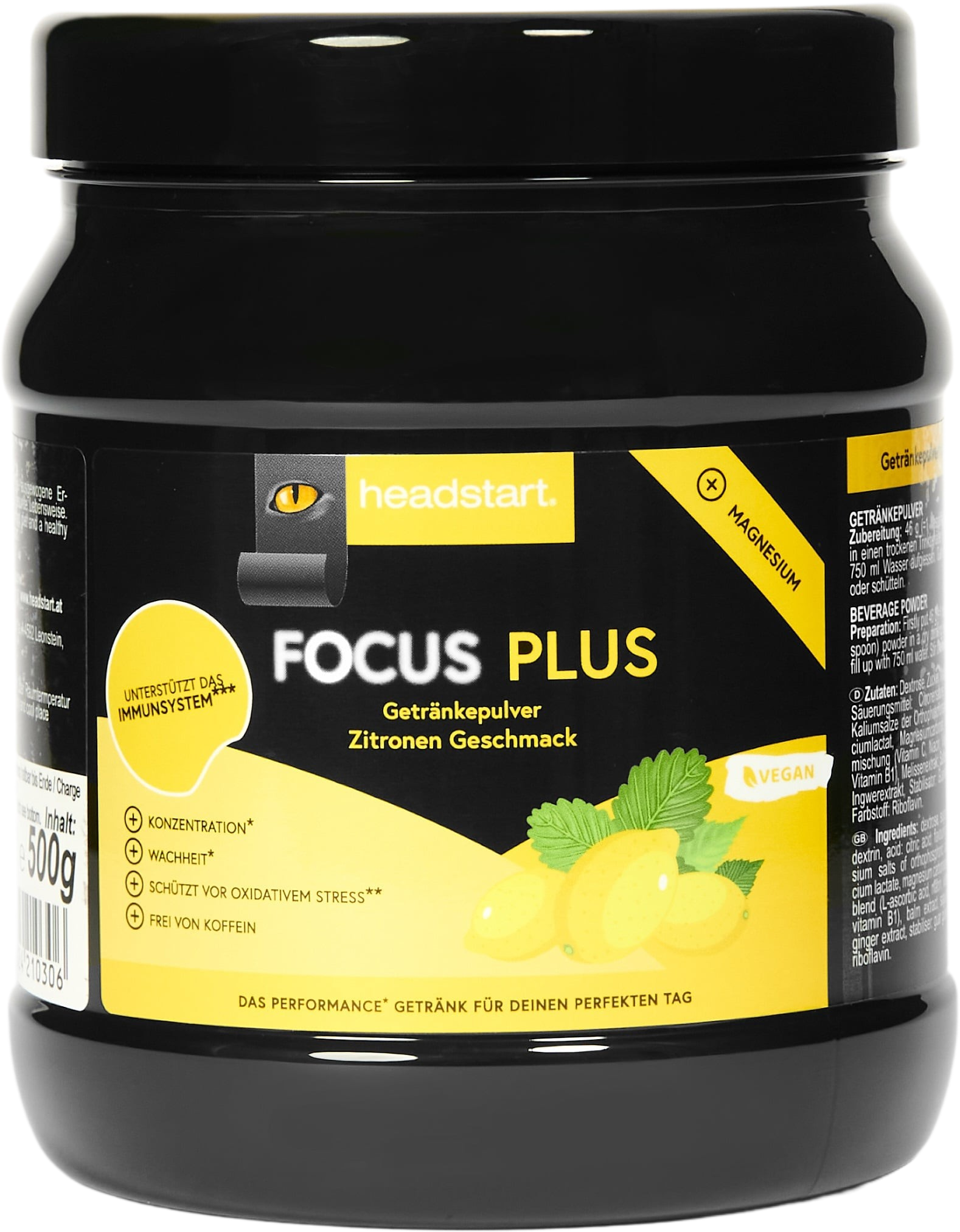 Tento nápojový prášek Focus Plus od značky headstart promění vodu v ovocně lehký citronový osvěžující nápoj - bez umělých barviv, aromat nebo konzervačních látek. Prášek bez kofeinu se snadno rozpouští ve vodě a nabízí příjemný chuťový zážitek. Díky kombinaci citronové chuti a vyváženého složení minerálních látek a vitamínů vzniká všestranný nápoj, který si můžeš vychutnat na cestách, při práci nebo ve volném čase.