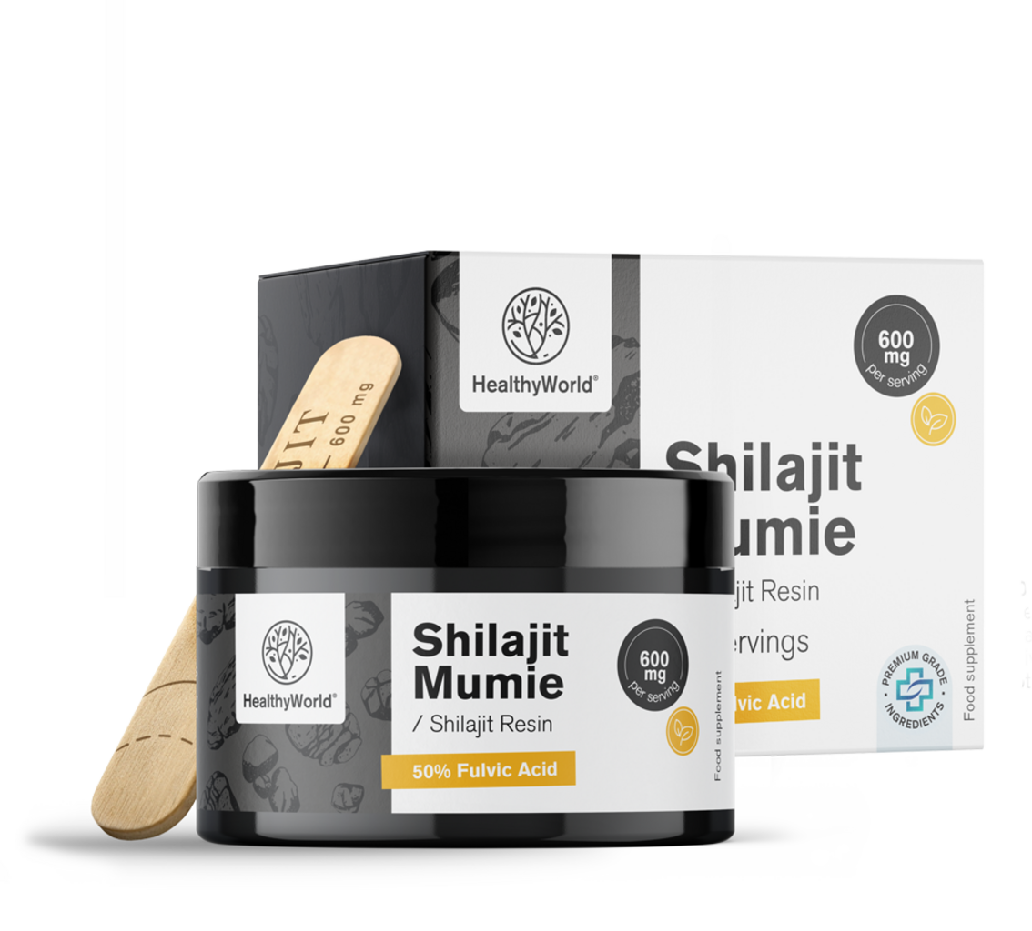 Tento produkt obsahuje shilajit (mumio) ve formě čisté přírodní pryskyřice, která je podle údajů výrobce zpracována bez jakýchkoliv přídavných látek. Shilajit vzniká po dlouhou dobu z rostlinného materiálu a minerálních složek za přirozených podmínek ve vysokohorském prostředí, díky čemuž má charakteristickou pryskyřičnou konzistenci.