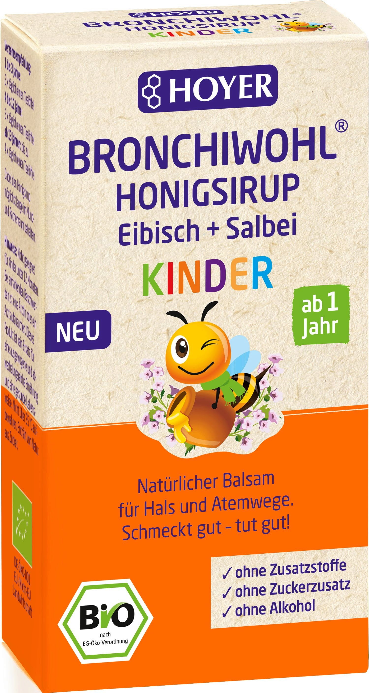Sirup Bronchiwohl s medem od HOYER je díky své jemné bezalkoholové receptuře vhodný pro děti od 1 roku. Obsahuje extrakt z kořene proskurníku a éterické oleje ze šalvěje a fenyklu. Má ovocně citronovou chuť. Receptura neobsahuje přidaný cukr.