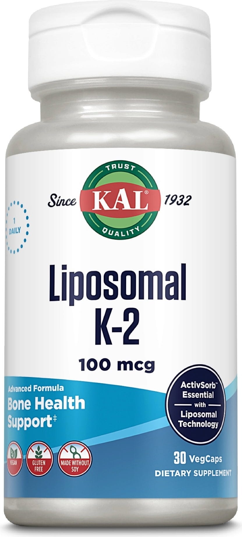 Tyto veganské a bezlepkové kapsle od KAL obsahují lipozomální K-2, což je vitamín rozpustný v tucích, který se nachází v některých masech a fermentovaných potravinách.