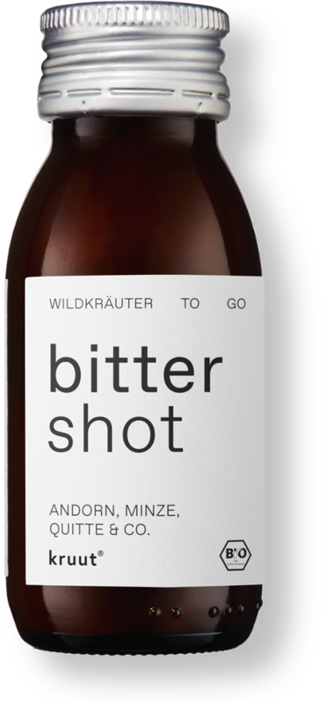 Bitter Shot od kruut kombinuje osvědčenou recepturu z přírodně nefiltrovaného Demeter jablečného octa a syrového květového medu s ovocnou sladkostí kdoule. Tekutá kompozice obsahuje výtažky z pelyňku, zeměžluče, jablečníku a máty peprné.