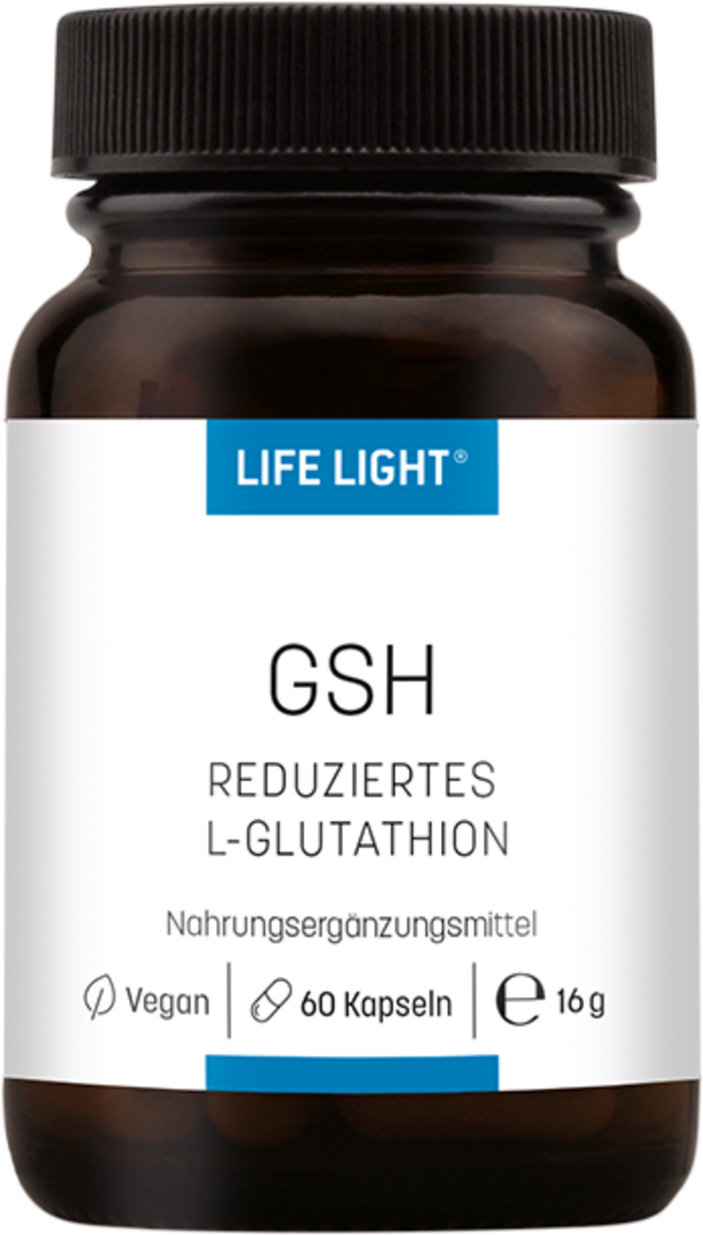 GSH - redukovaný L-glutathion značky Life Light představuje ortomolekulární tripeptid 3 aminokyselin pro zvláštní fyziologickou potřebu živin, který byl obohacen o vitamín E. Glycin, cystein a kyselina glutamová.