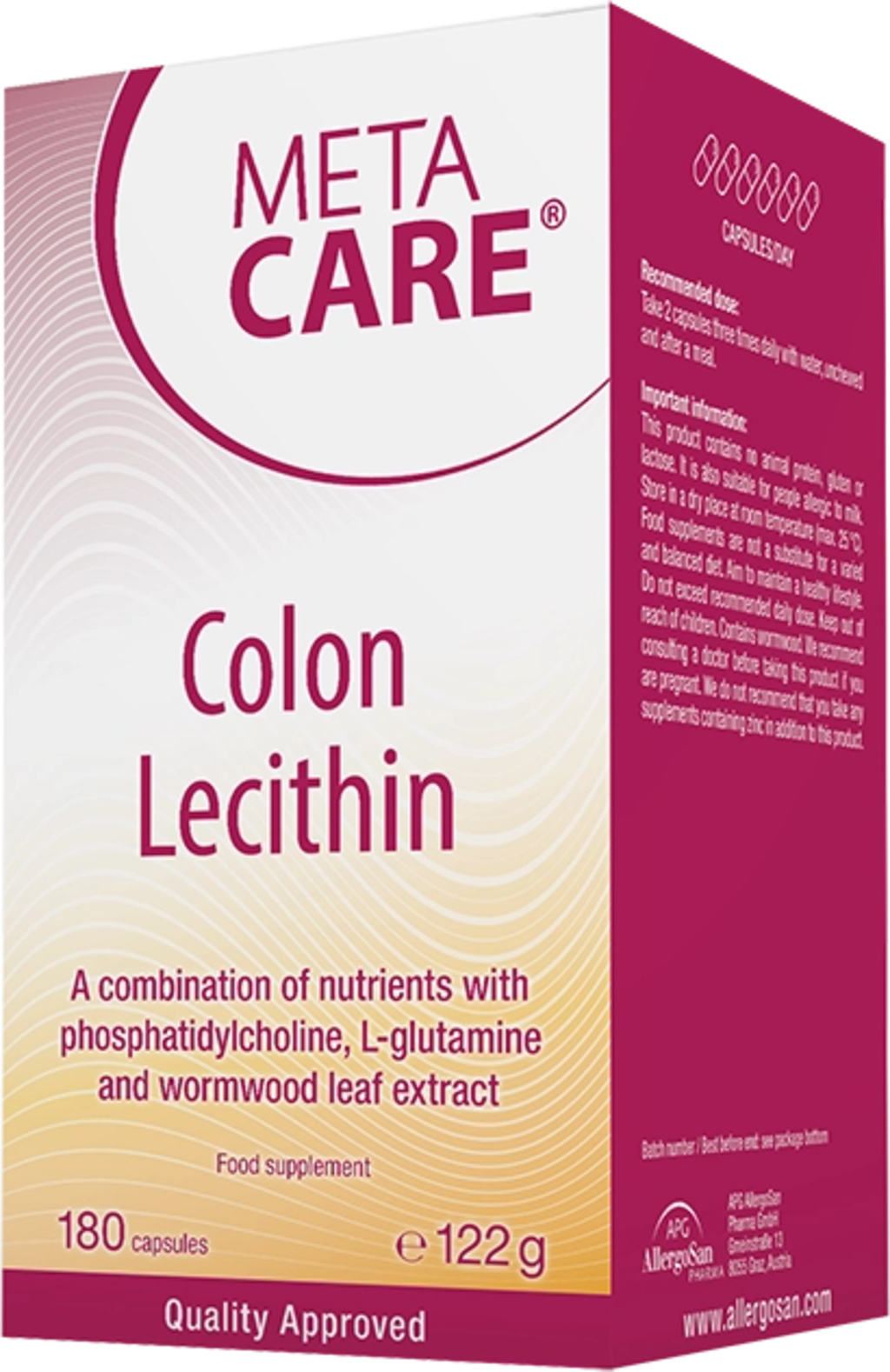 META-CARE® Colon-Lecithin dodává vysoce kvalitní fosfatidylcholin (lecitin) ve formě kapslí. Složení je navíc doplněno o vitamín B6, vitamín B12, zinek, L-glutamin a extrakt z listů pelyňku.