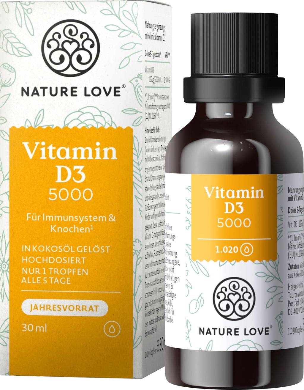 S kapkami vitamínu D3 značky Nature Love máte v rukou trochu slunce. Jedna kapka oleje obsahuje 5000 IU jednotek vitamínu D3 (cholekalciferolu), což odpovídá 125 µg.