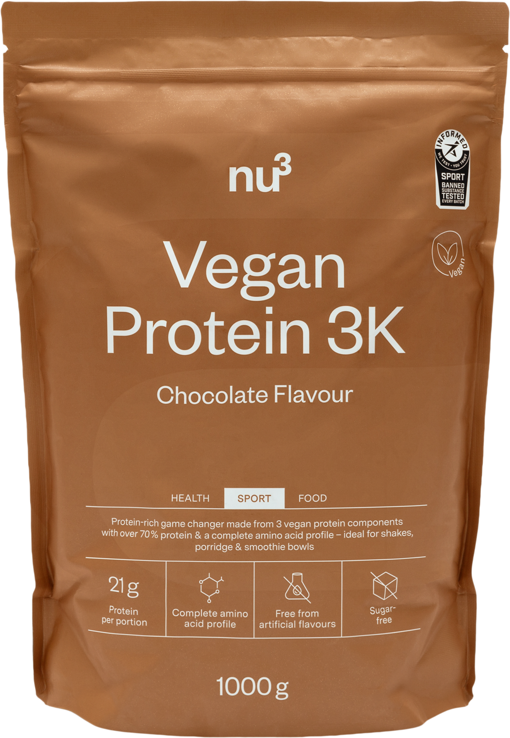 Objevte nu3 Vegan Protein 3K – Váš rostlinný proteinový prášek. Kombinace hrachového, rýžového a slunečnicového proteinu poskytuje vysoký obsah bílkovin přes 70 % – ideální pro snadné zvýšení příjmu bílkovin.