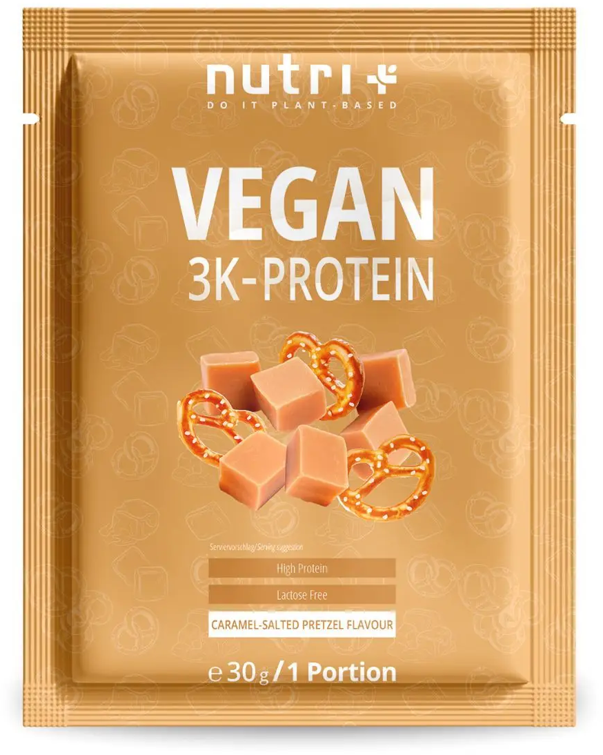 nutri + Vegan 3K proteinový prášek – zkušební balení, Caramel-Salted Pretzel (30 g)