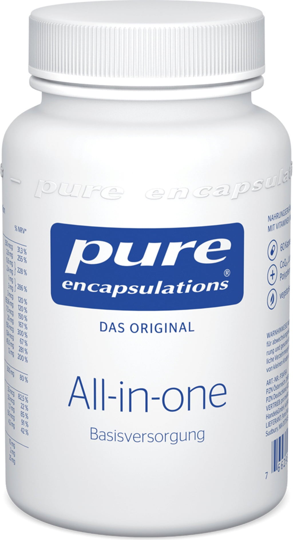All-in-one značky Pure Encapsulations představuje hypoalergenní multivitamín obsahující nejdůležitější vitamíny, minerály, stopové prvky a navíc koenzym Q10, lutein a polyfenoly z extraktu z hroznových jader.