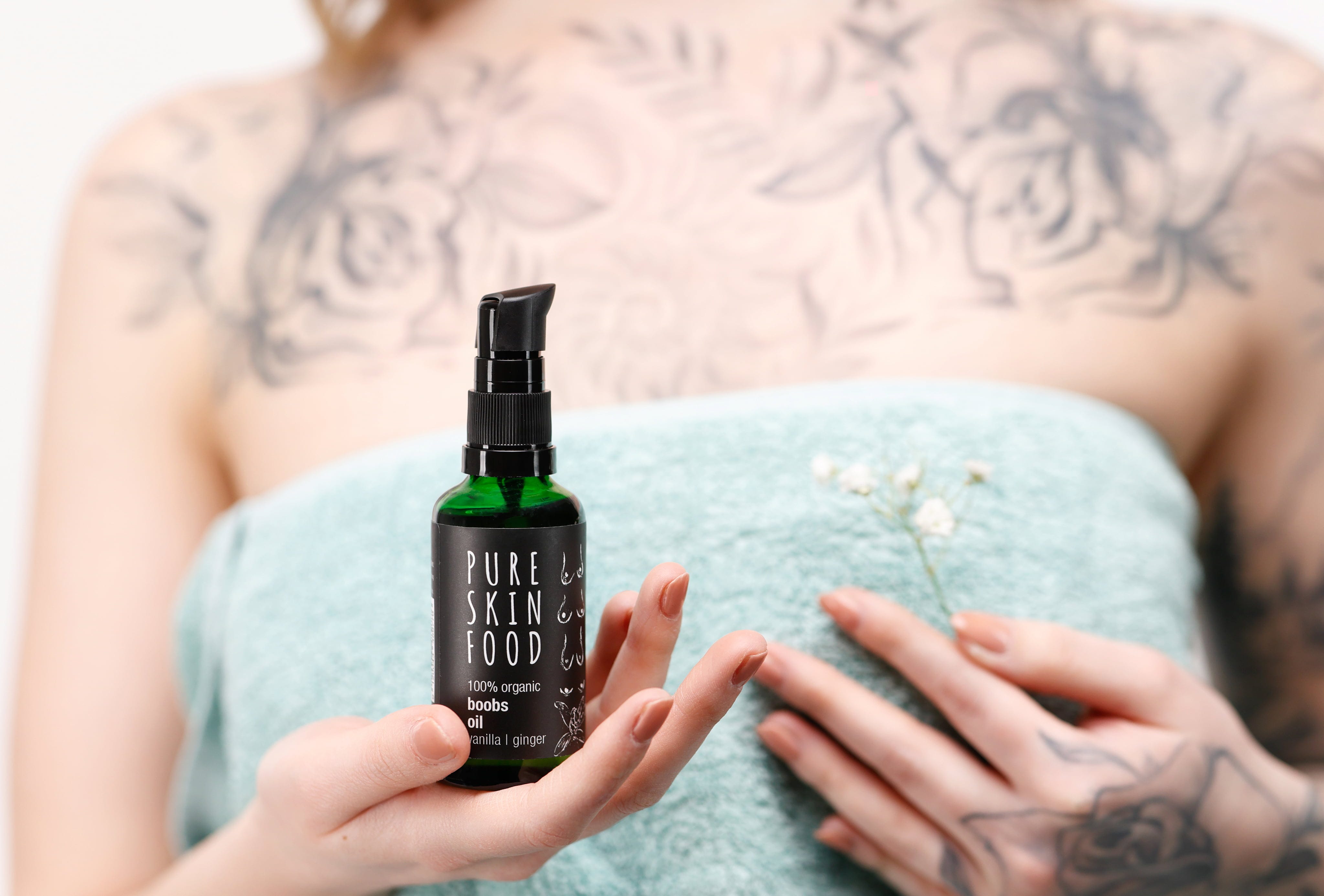 Organic Boobs Oil obsahuje širokou škálu antioxidačních složek, jako je olej z hroznových jader, extrakt z amarantu, extrakt ze semen granátového jablka a olej z mučenky.