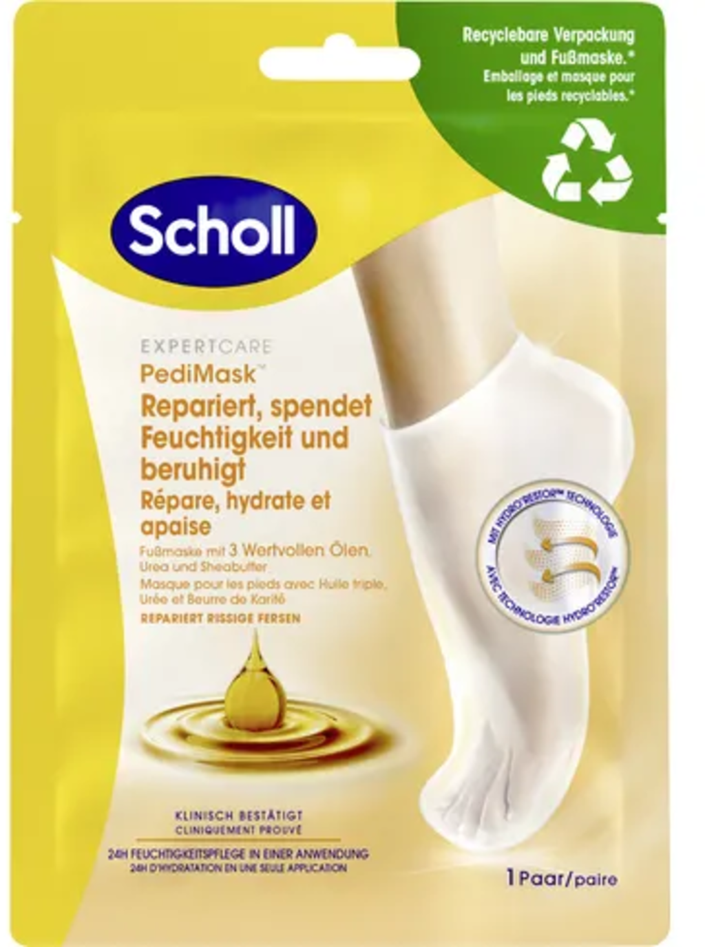 Maska na nohy ExpertCare ve formě ponožek intenzivně pečuje o suchá chodidla. Spolu s ureou zajišťují cenné oleje z avokáda, arganu a jojoby dlouhotrvající pocit péče o chodidla.