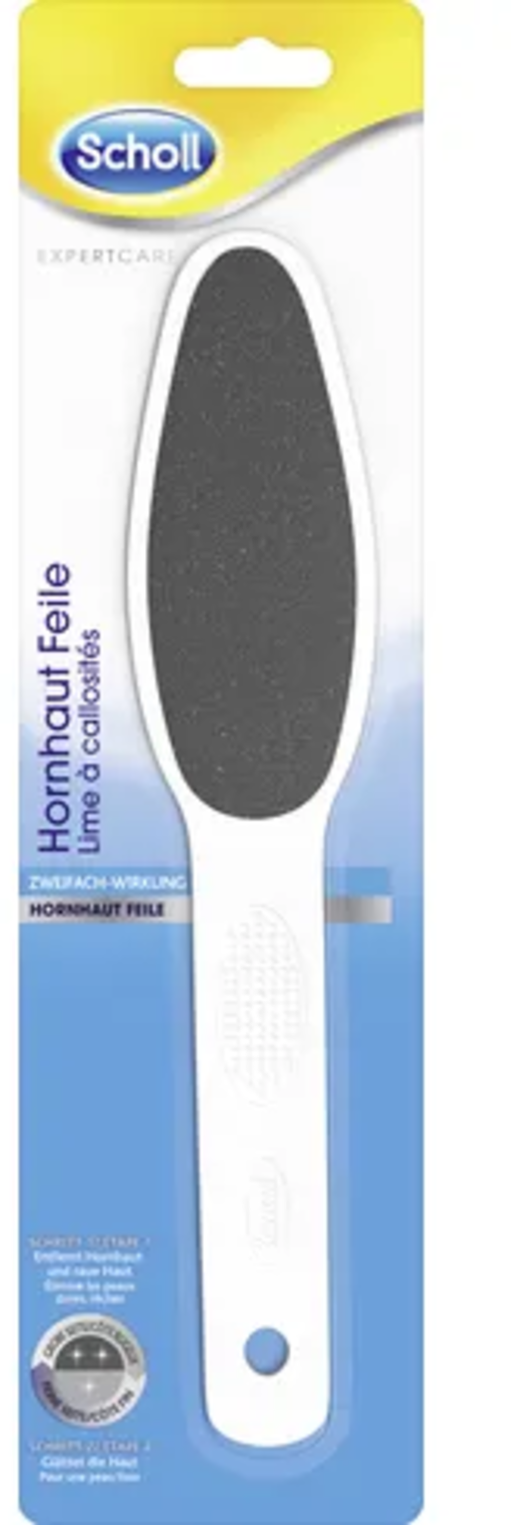 Pilník na zrohovatělou kůži ExpertCare od značky Scholl pomáhá při pilování a vyhlazování plosek chodidel. V prvním kroku se pokožka piluje, ve druhém kroku se optimálně vyhlazuje.