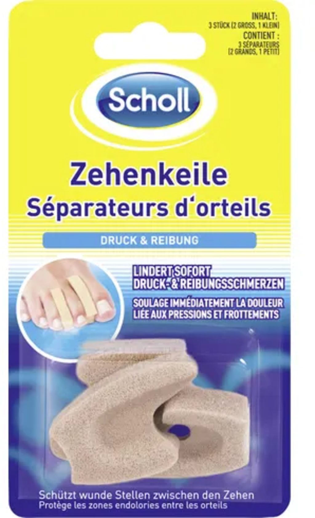 Oddělovače prstů od značky Scholl ideálně chrání oblast mezi prsty na nohou. Měkkou pěnu lze umýt rukou a jemným mýdlem a je opakovaně použitelná.
