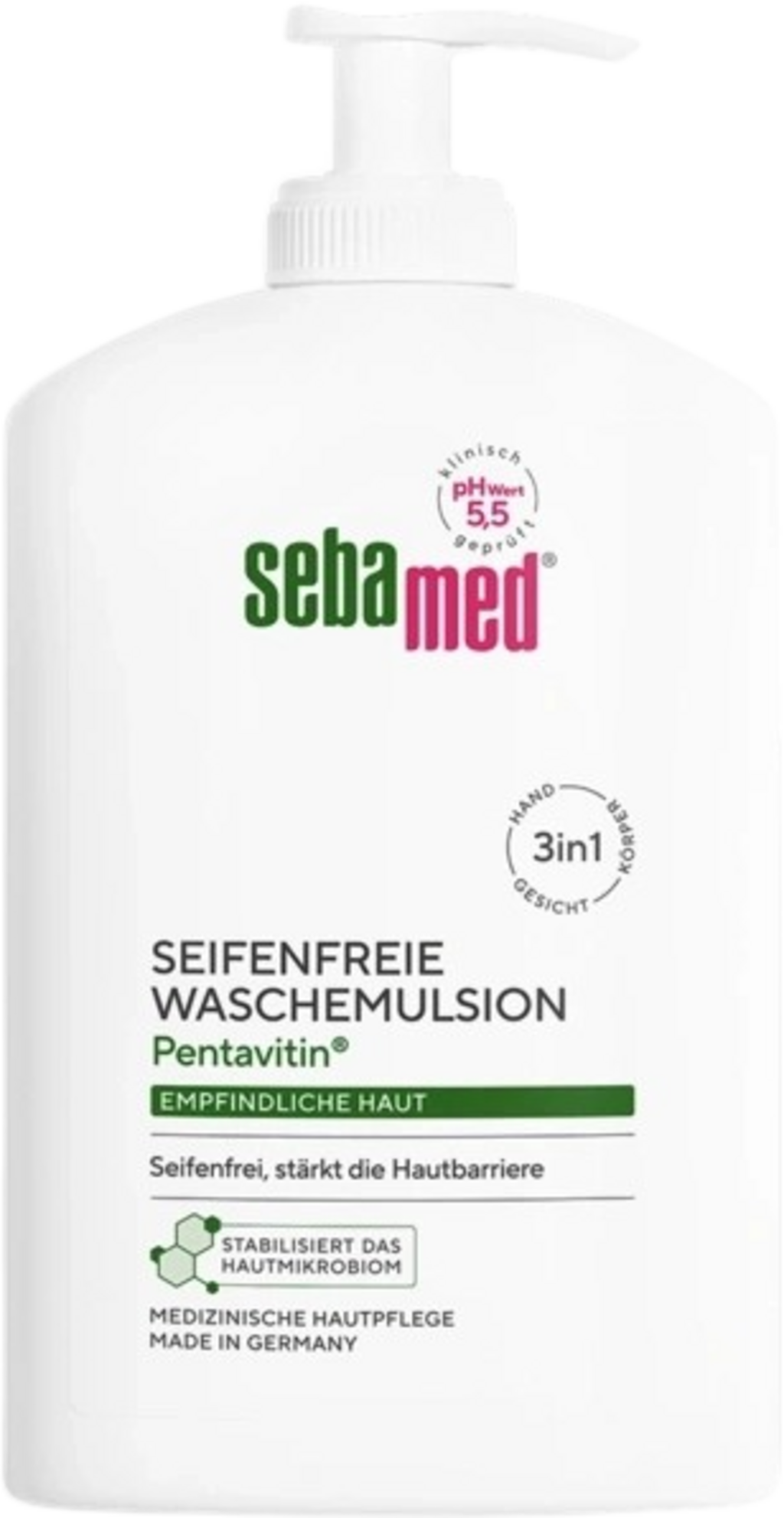 Mycí emulze sebamed® jemně čistí citlivou pleť. Složení bez mýdla a mikroplastů má hodnotu pH 5,5 a je vhodné pro každodenní čištění. Emulze je obohacena o alantoin, glycerin a panthenol.