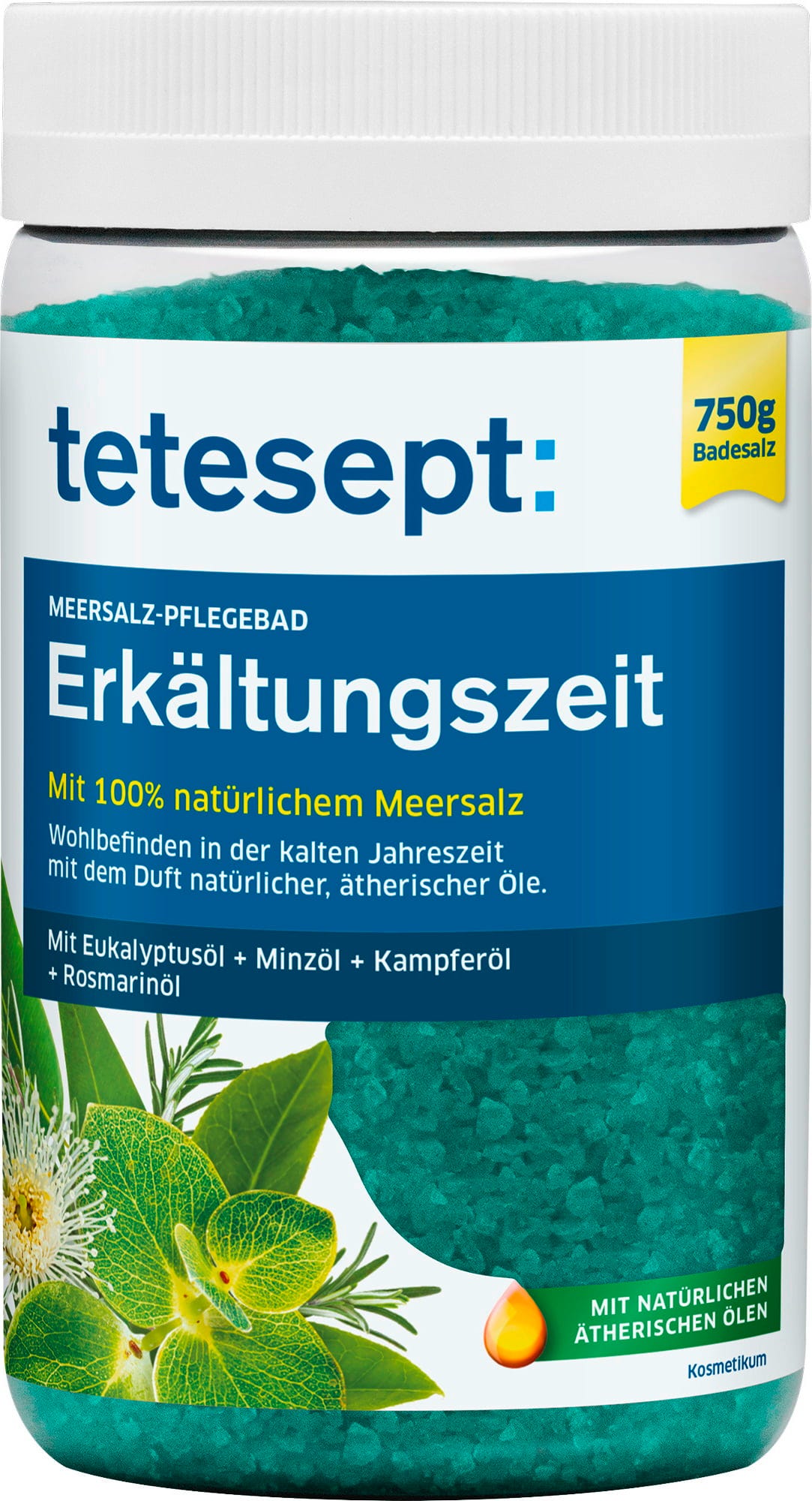 Právě v deštivém a chladném období není nic lepšího než si po dlouhém dni dopřát voňavou hřejivou koupel. "Období nachlazení" mořská sůl od tetesept je pro takovou relaxaci ideální volbou. Veganské složení má pečující účinky na pokožku a obsahuje pouze přírodní éterické oleje z eukalyptu, máty, rozmarýnu a kafrovníku.