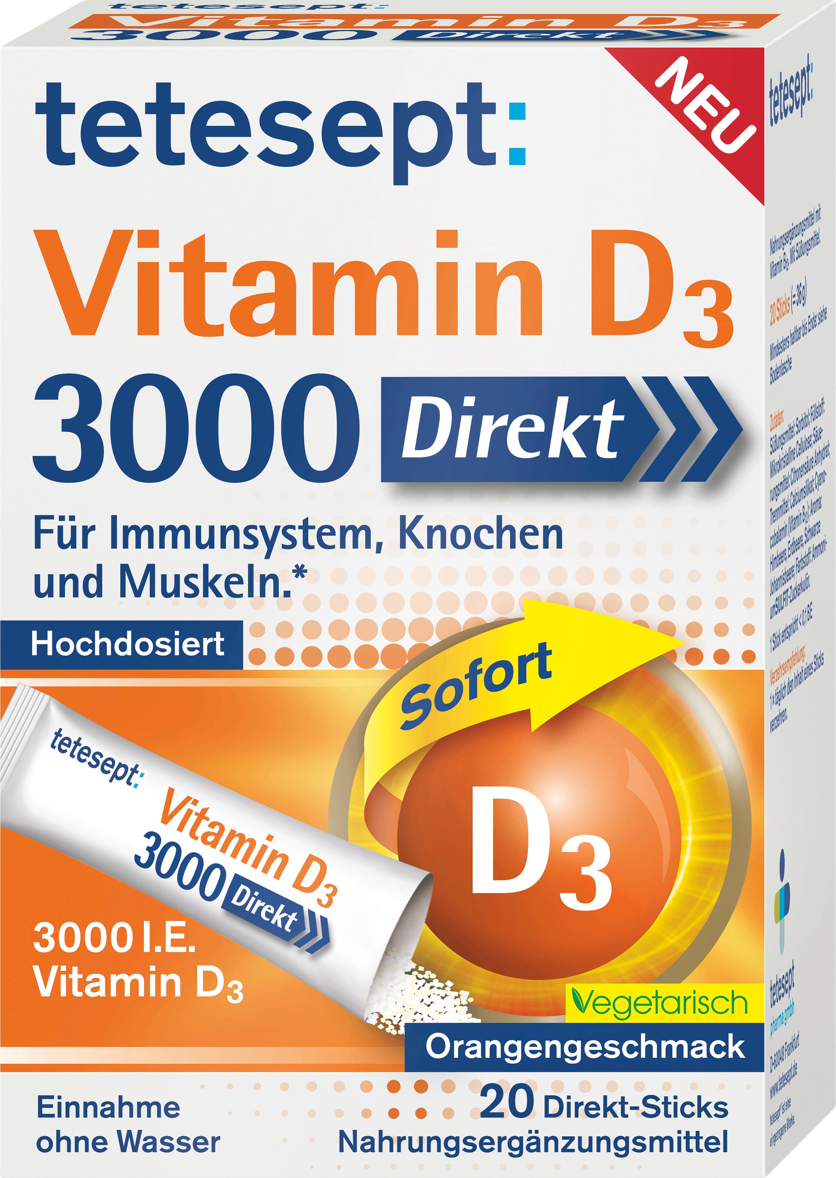 Vitamín D3 3000 Direkt Sticks od tetesept přinášejí vysokou dávku vitamínu D3 v praktické práškové formě. Prášek má ovocnou pomerančovou příchuť a lze jej užívat i bez vody – příjemně a pohodlně. Produkt je bez lepku a laktózy.